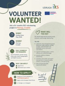 Descripción: La asociación Udruga IKS busca 1 persona joven (18–30 años) para participar en un proyecto de voluntariado de largo plazo del Cuerpo Europeo de