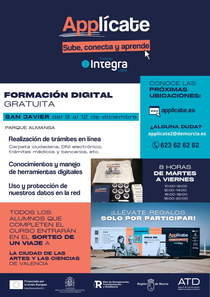 Se ofrece formación digital gratuita que se impartirá en un aula móvil ubicada en San Javier y se emplazará en el Parque Almansa del 9 al 12 de Diciembre.
