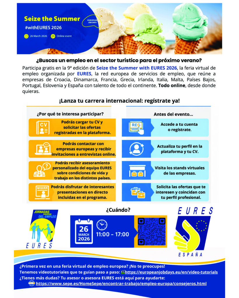 Ya está abierto el registro para la 9ª edición de Seize the Summer with EURES 2026, una feria de empleo virtual diseñada para que personas desempleadas o que quieran cambiar de aires y trabajen en el sector servicios, Turismo, Hostelería (HORECA) y Ocio/Animación en Europa.
